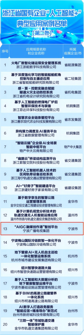 9月25日,浙江省国资委发布第二批20个“人工智能+”典型应用案例名单,宁波广电集团打造的“AIGC融媒创作港”智创平台凭借其在传媒领域的创新实践与显著成效成功入选。