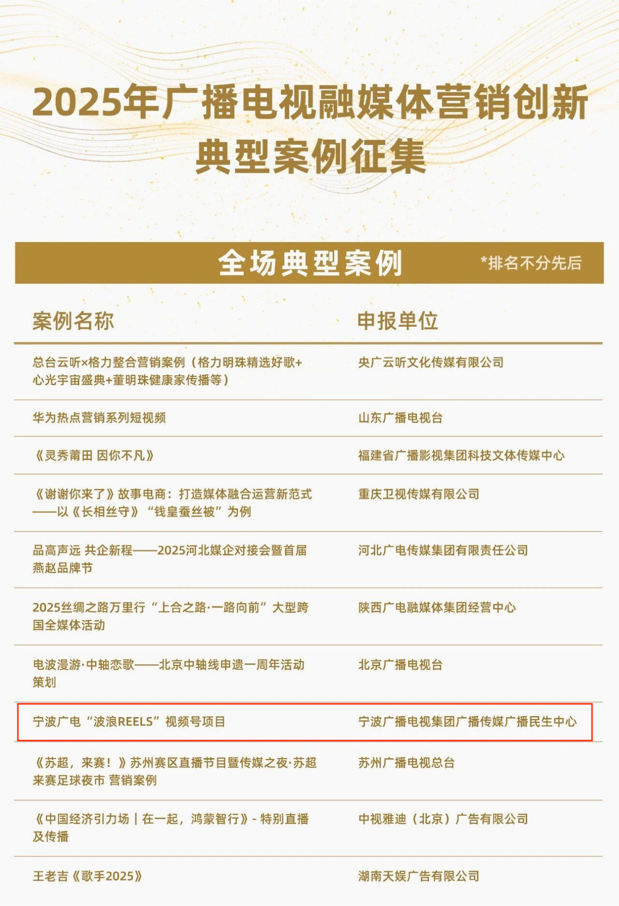 9月30日,由中国广告协会指导,中国广告协会广播电视融媒体工作委员会与中国广告协会公益广告工作委员会共同主办的“2025年广播电视融媒体营销创新典型案例征集活动”揭晓评选结果。宁波广电集团广播传媒民生中心报送的“宁波广电‘波浪Reels’视频号”项目,凭借其在融媒体营销方面的创新实践,获评“全场典型案例”。
