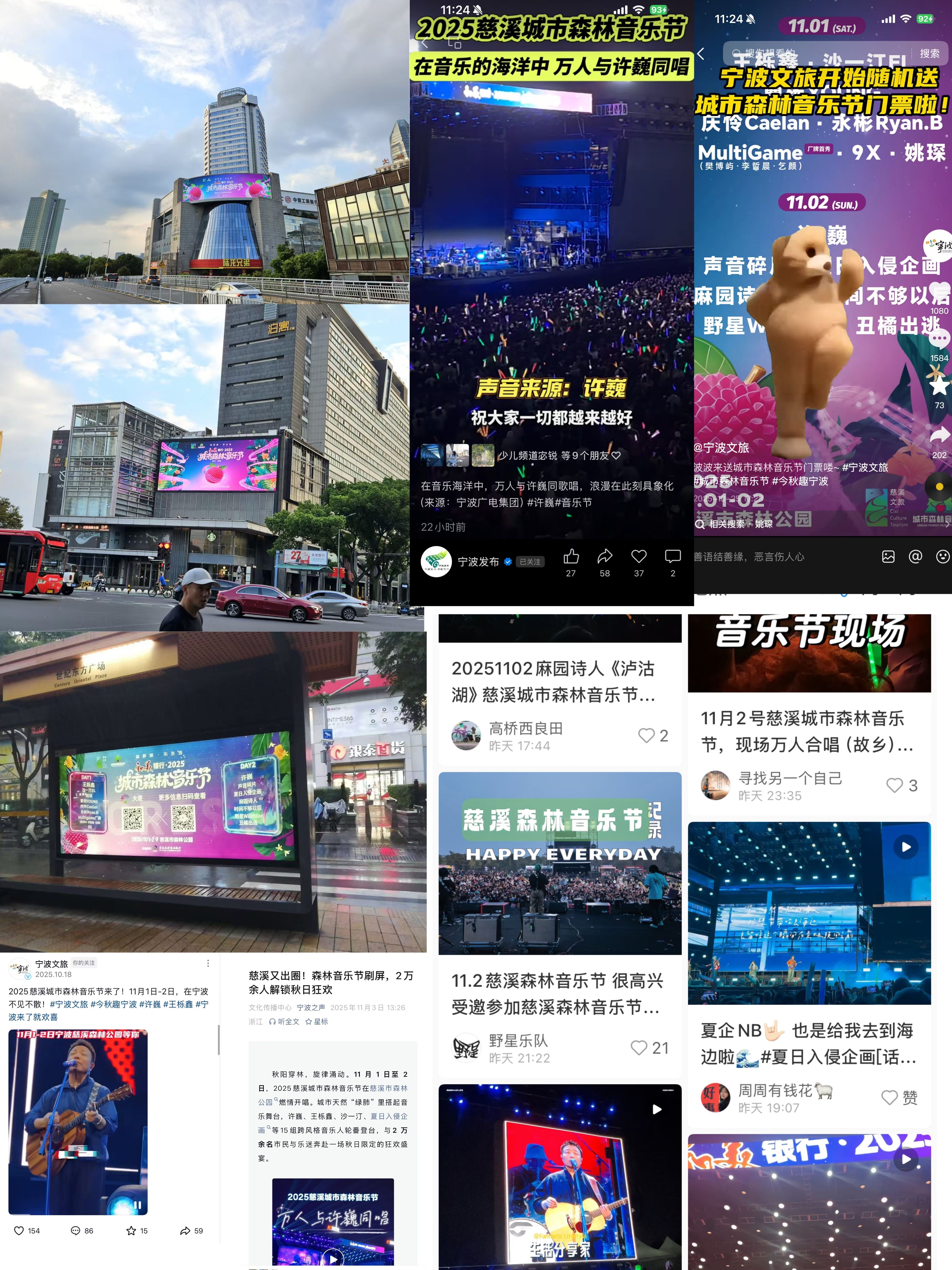 2025慈溪城市森林音乐节,前中后期通过全国媒体宣传矩阵,如宁波发布、宁波文旅视频号抖音号、宁波之声公众号视频号、甬派等市级媒体,进行集中火力宣发。新媒体宣发方面,新媒体端公众号、视频号、抖音、小红书全渠道推广造势,数百条宣传引爆话题,相关话题、文章、视频播放量超2.2亿。户外广告刷屏式绽放宁波街头核心地区,天一广场等人流密集区大屏幕及公交灯箱全天候露出,累计曝光量触达人群500万人次。在音乐节售票阶段,精准定位高校人群,在宁波14所高校学生微信群发动宣传。宁波广电集团音乐广播、交通广播针对私家车主群体设置话题,结合音乐节艺人阵容在早晚高峰主力节目里进行高频次的硬广及口播,相关宣推链接转发26个听众群。本次宣传带动2万余人亲临音乐节现场,参与万人大合唱。