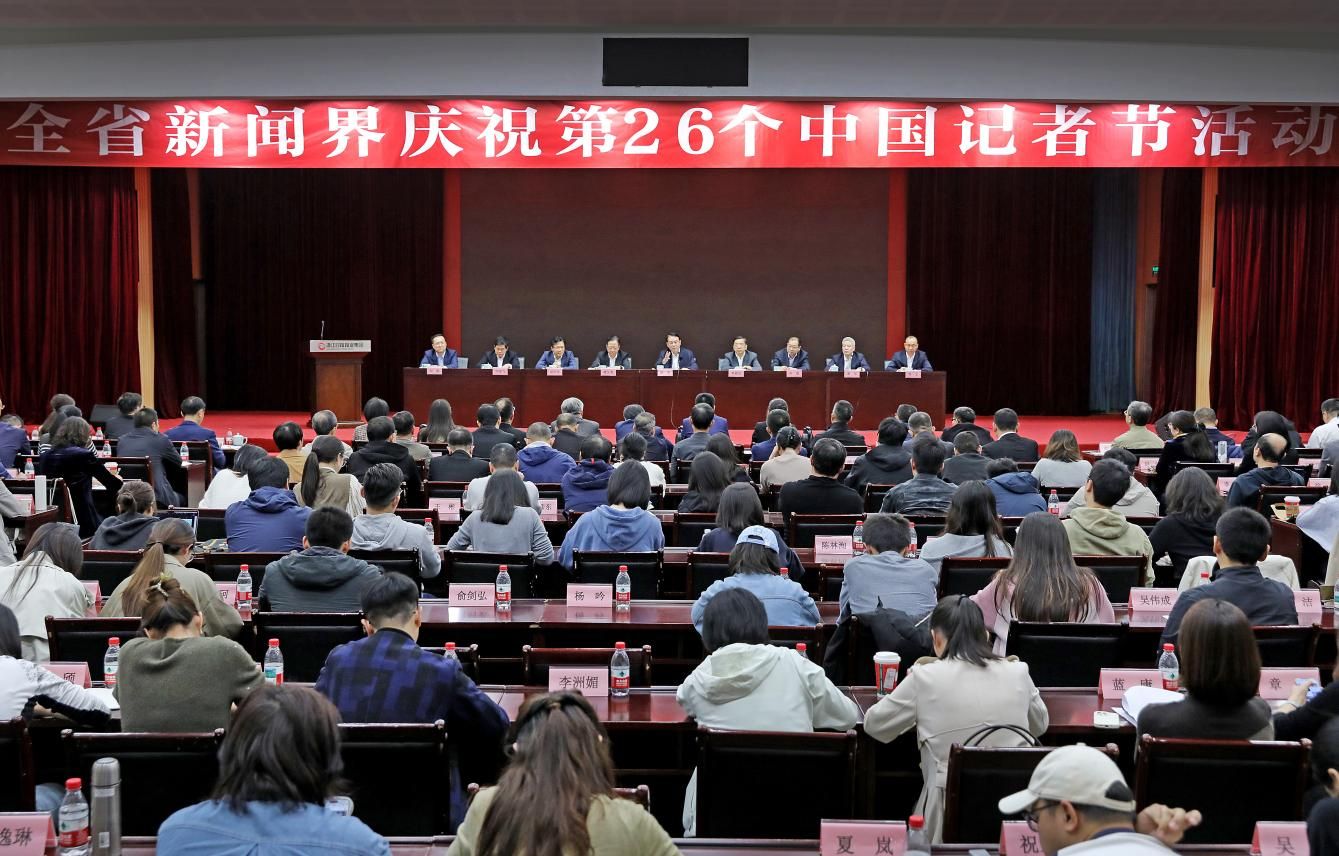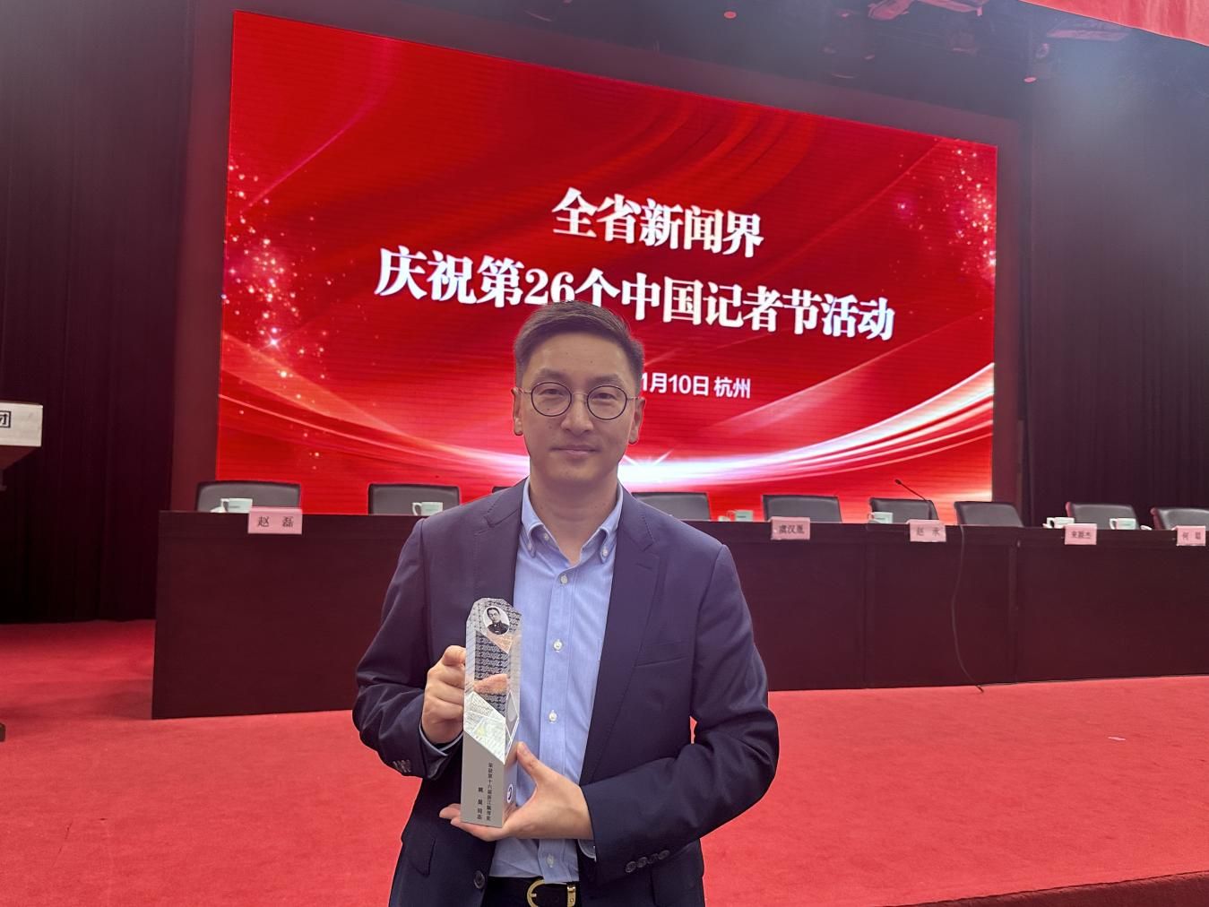 11月10日下午,浙江省新闻界庆祝第26个中国记者节暨颁奖报告会在杭州隆重举行,会议向首届“全国十佳新闻工作者”和中国新闻奖、浙江飘萍奖、浙江新闻奖获奖代表颁奖。宁波广电集团姚昊作为第十六届浙江飘萍奖获得者,在报告会上接受表彰并发言。