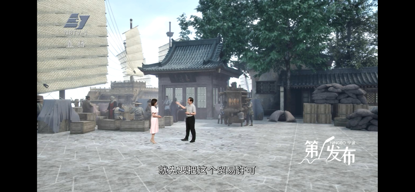 XR打造的虚拟场景加持是这一系列的一大亮点,实现多媒介融合,“时空双线叙事”。每期节目前半部分在海洋文化地标取景,结合季节变化,增强视觉美感;“下半场”XR场景的加入,在实景基础上叠加虚拟元素,如建筑遗迹,形成了“现实与历史”的对话。其中第四期“潮起三江千帆竞”中,XR技术复原了两宋时期宁波港的重要组成部分——来安门。随着发布人讲述,这道“门”也动了起来,徐徐打开。当时的宁波港码头在屏幕里重生,主持人和发布人一同体验海上贸易流程,从货物装卸到海关验货,沉浸式感受古代港口的商业活力。这期节目获发布人肯定,XR场景使历史叙事更具说服力。