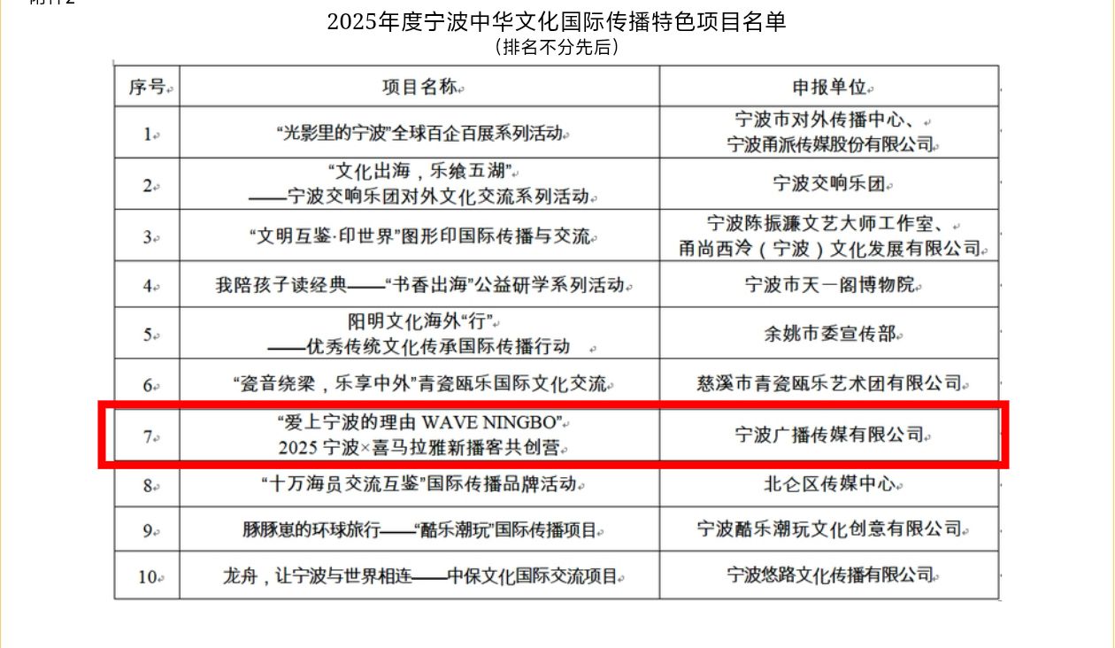 宁波广电集团携手喜马拉雅,以音视频相结合的“新播客”形式向世界展示宁波的独特魅力,通过新播客共创营、脱口秀等一系列精彩活动进行优质内容创作,经由融媒传播成功打造城市文化传播新范式。“爱上宁波的理由 WAVE NINGBO”2025宁波×喜马拉雅新播客共创营项目被评为2025年度宁波中华文化国际传播特色项目。