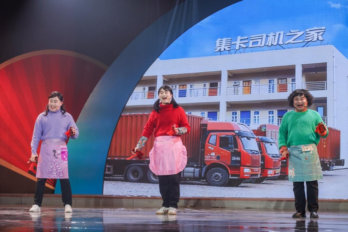 取材于集卡司机家庭真实生活的群口快板《三个卡嫂来吐槽》,由文化特派员反串表演,一句句朴实又接地气的台词,道出了“车轮上的家”的酸甜苦辣,也折射出宁波“集卡司机之家”“共富工坊”的暖心举措。