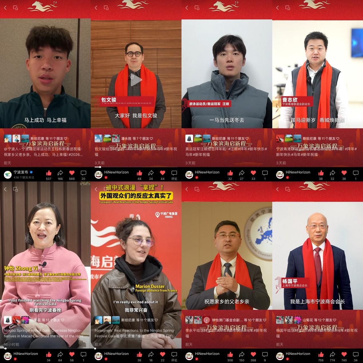 团队还精雕细琢,拍摄创作了2026宁波春晚倒计时视频;五天时间顺利完成包括奥运冠军汪顺、宁波籍足球运动员王钰栋等在内的14个新春祝福视频,通过宁波广电集团大屏端、宁聚新媒体传播矩阵、NewHorizon广电国传官方账号宣发;同时根据市委宣传部统一部署,通过市级其他新媒体账号向海内外送上新春祝福。
