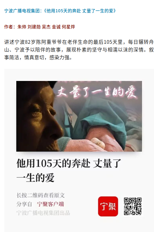 3月23日,中国记协微信公众号“我的代表作”栏目展示第九十八期入选作品。宁波广电集团电视传媒创作的短视频《他用105天的奔赴 丈量了一生的爱》榜上有名。
